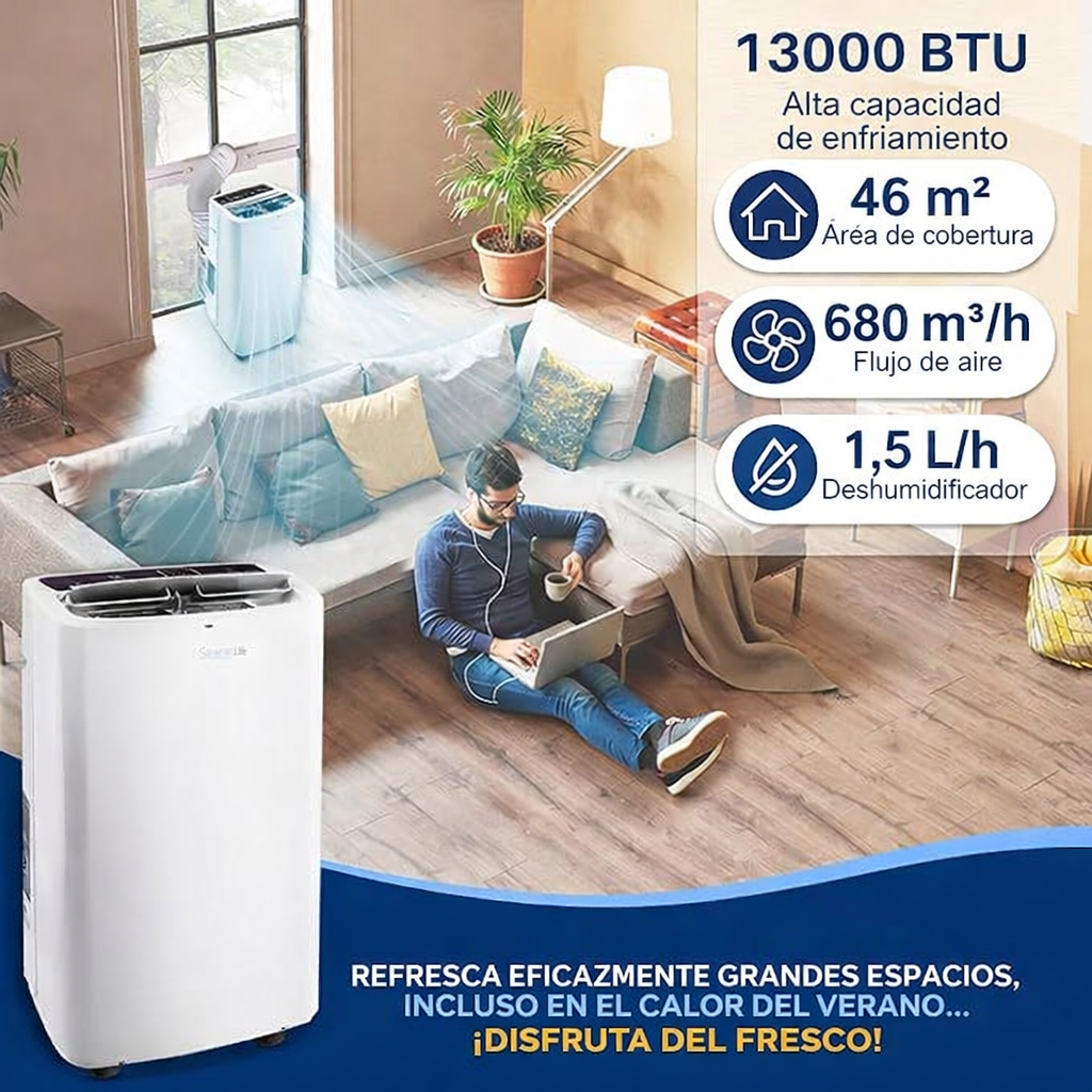 Crea un ambiente muy agradable y fresco en cualquier espacio cálido de tu hogar u oficina, gracias a los 13 000 BTU de potencia de este aire acondicionado portátil. Tu aire acondicionado portátil, fácil de instalar.